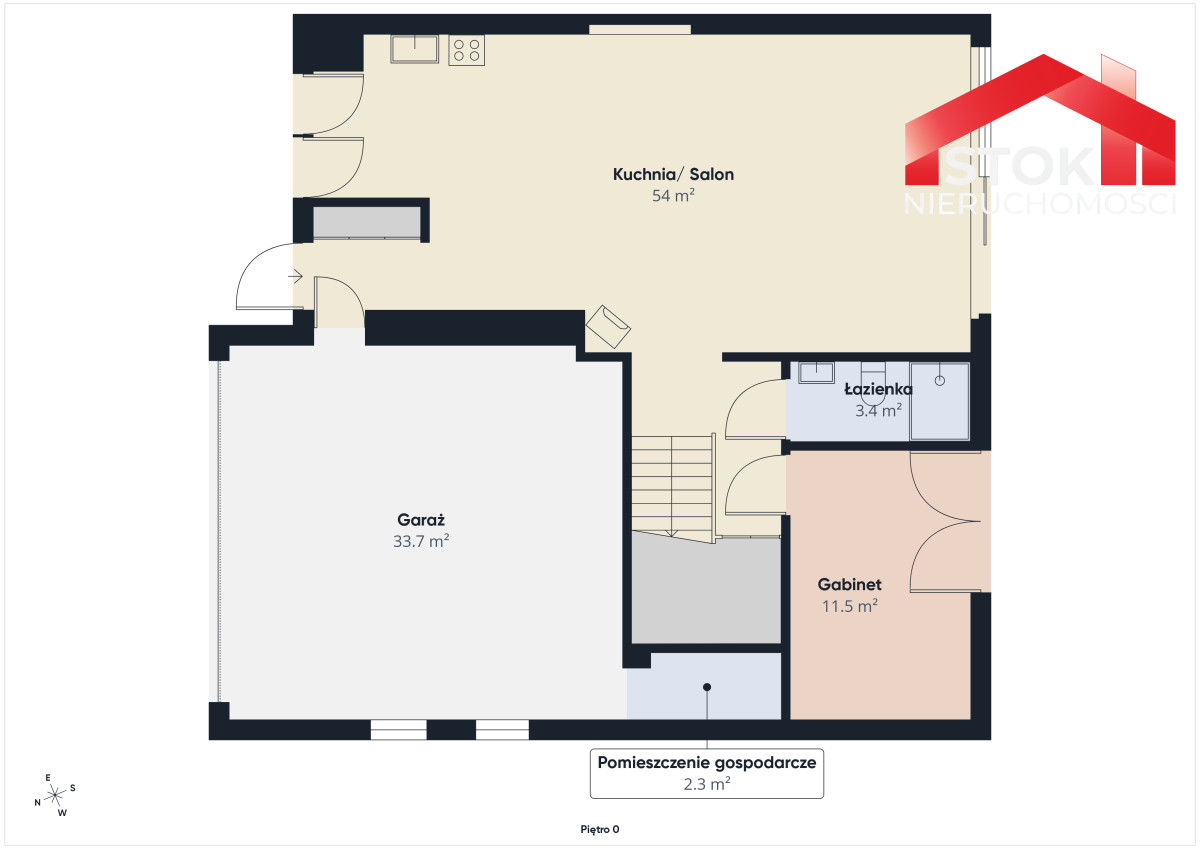 - Parter (Strefa dzienna): Przestronny salon z wyjściem na taras, otwarta kuchnia z jadalnią, gabinet/sypialnia oraz łazienka gościnna.