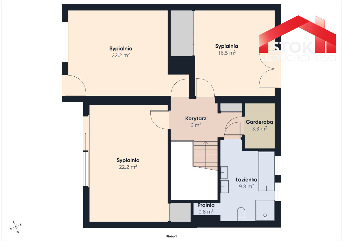 - Piętro (Strefa prywatna): Trzy ustawne sypialnie, garderoba oraz duży pokój kąpielowy.