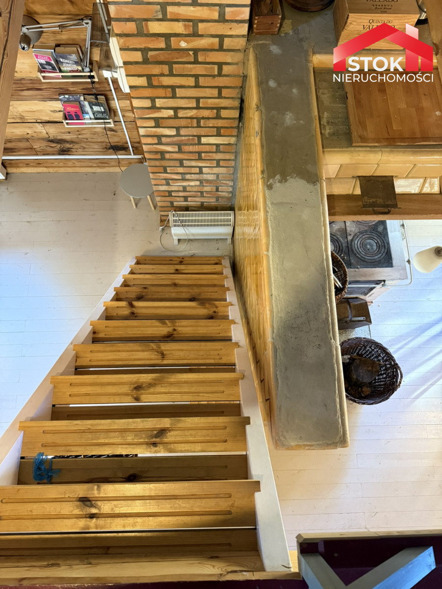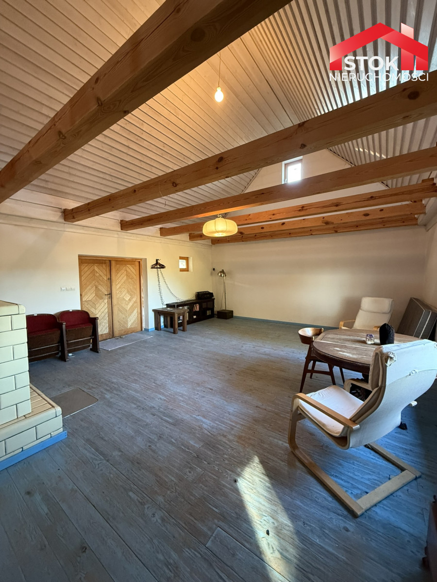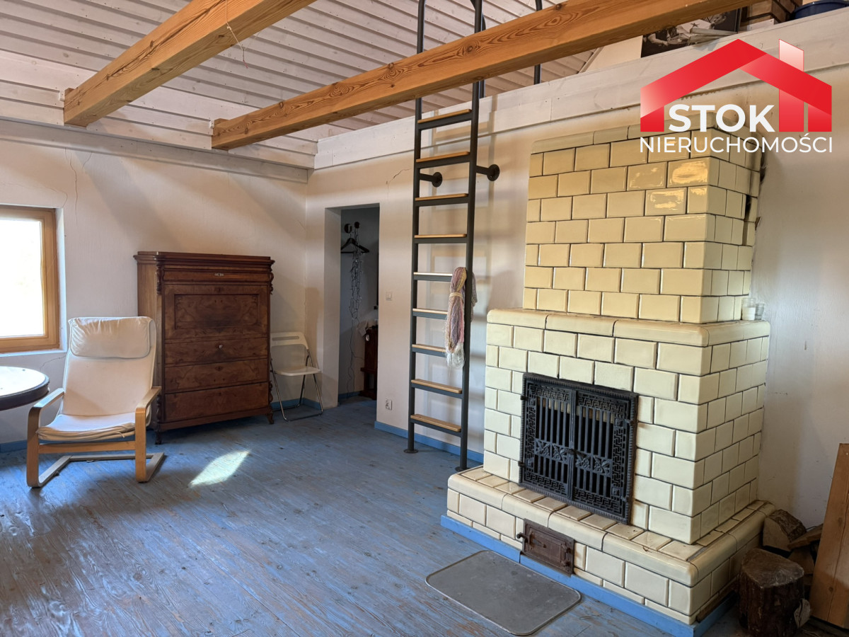 • Salon z kuchnią - 40,16 m² (8,08 × 4,97 m) z centralnie usytuowanym piecem kaflowym ze stalową płytą grzewczą, który tworzy wyjątkowy klimat i zapewnia ciepło.